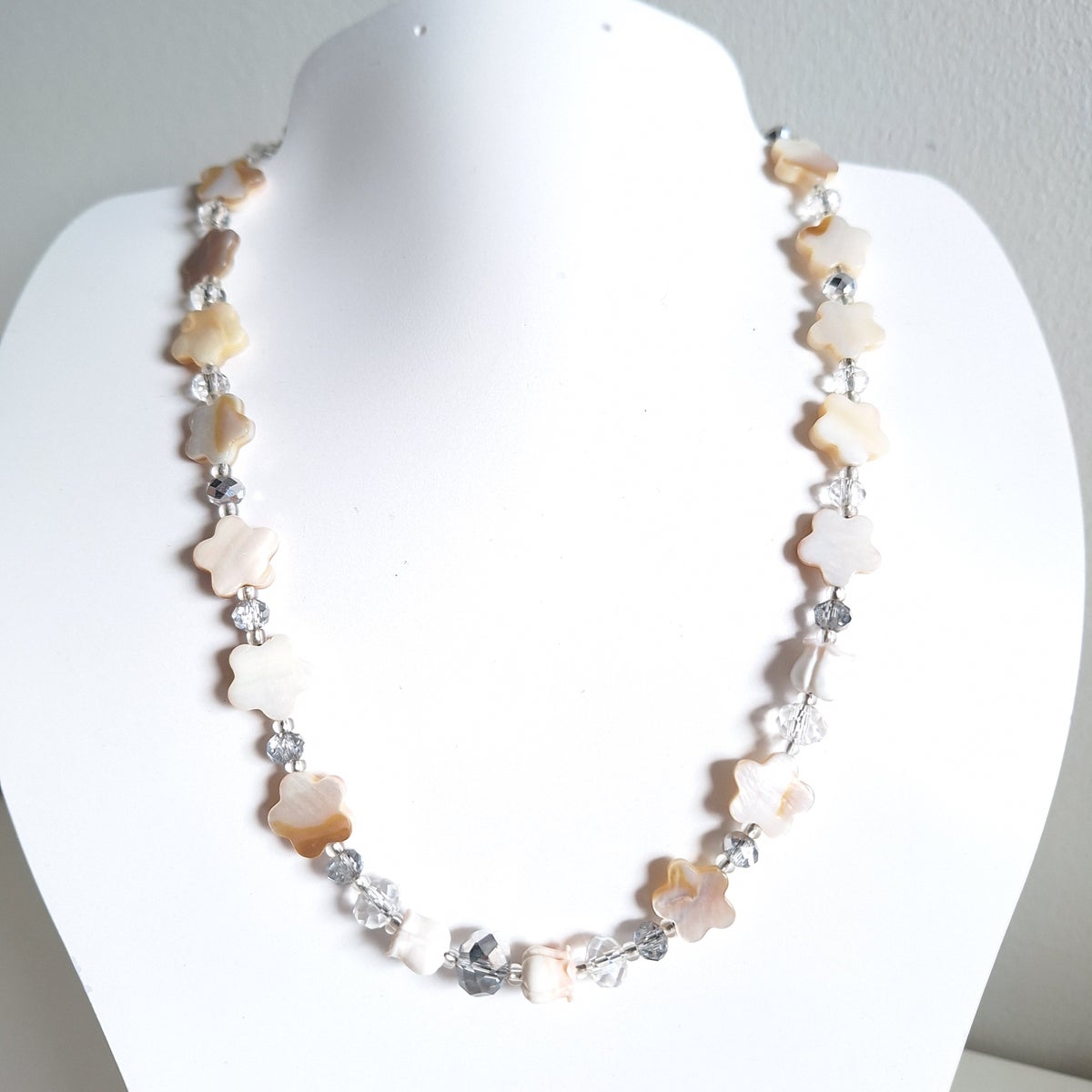 Simpukkahelmistä valmistettu kukkakortti lasisilla välihelmillä. Osa helmistä käsitelty hopeanhohtoisiksi.