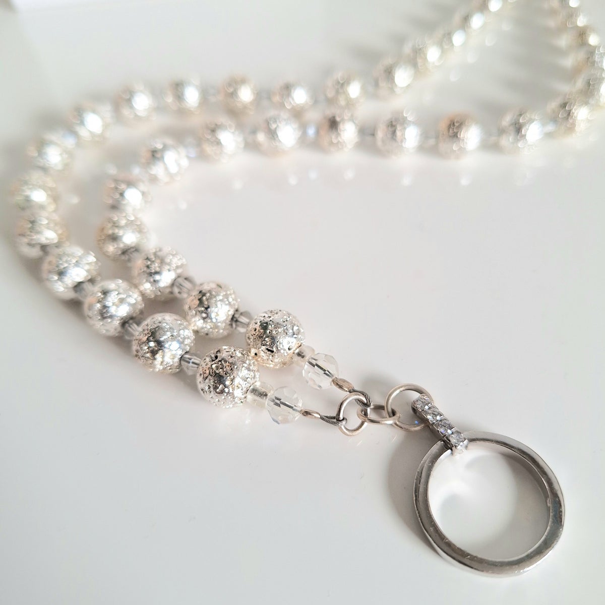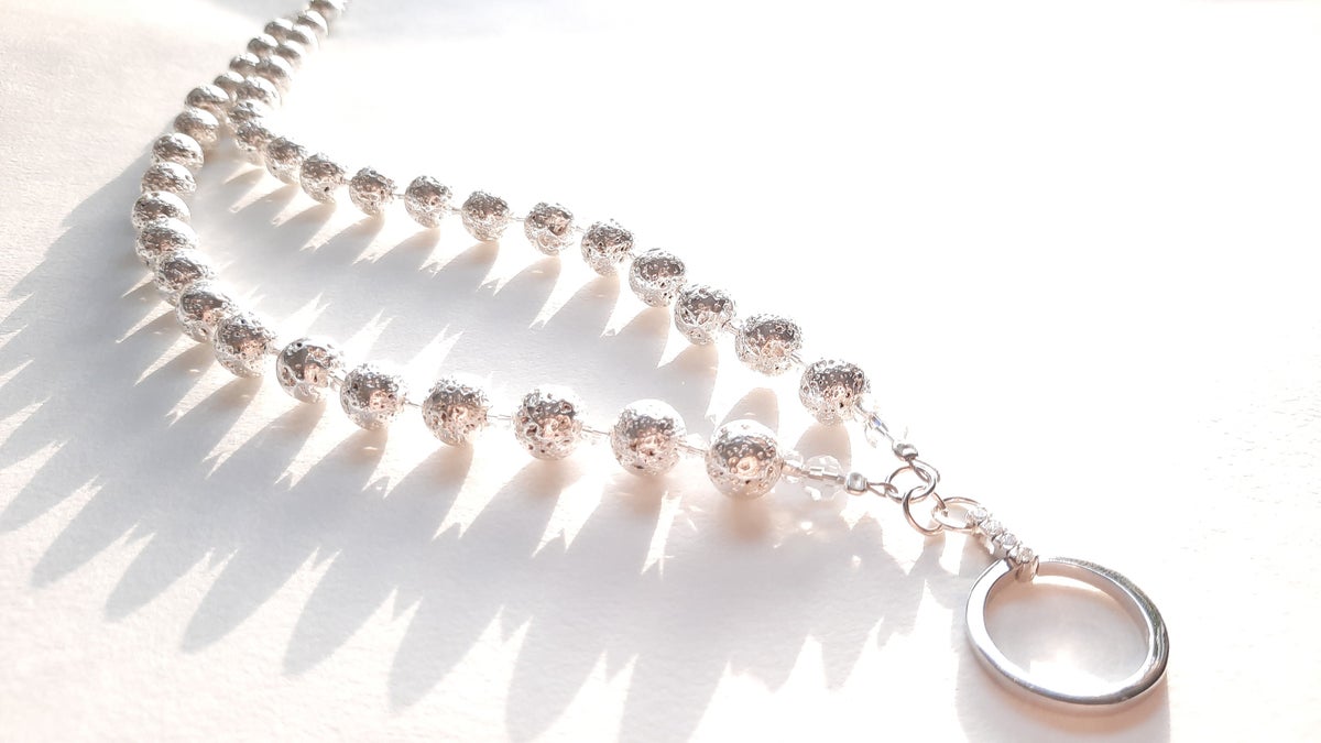 Hopeanväriseksi pinnoitettu laavakivi, jossa 925 hopeinen riipus zirkoneilla.
